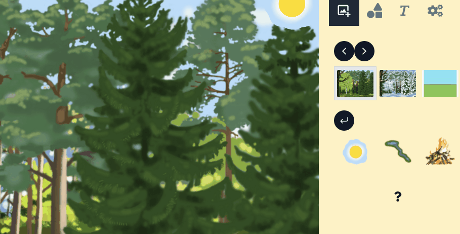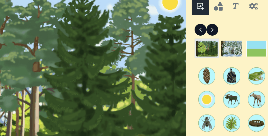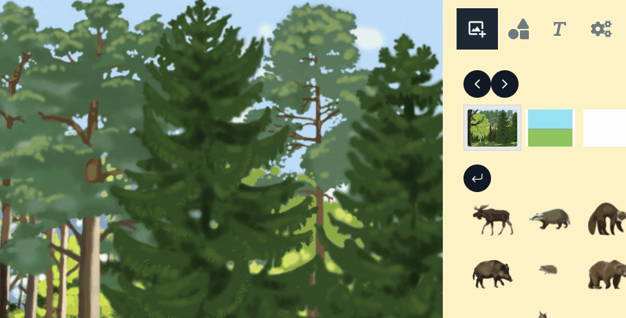 Blakus darba lapai ir pieejami dažādi objekti (egle, ezis, saule un citi). Visi objekti ir izvietoti kategorijās (dzīvnieki, abinieki, augi un citi).