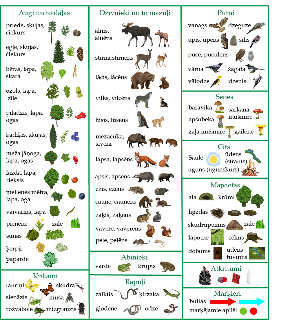 - Katram dzīvniekam un putnam sameklēt visu iespējamo barību, kuru viņš lieto ikdienā (lācis - alnis un stirna ar mazuļiem, olas, slieka, augi, pele ar pelēniem, sēne utt.; mežacūka - zīles, sēne, olas, putnēni, zaķēns, pelēni utt.).